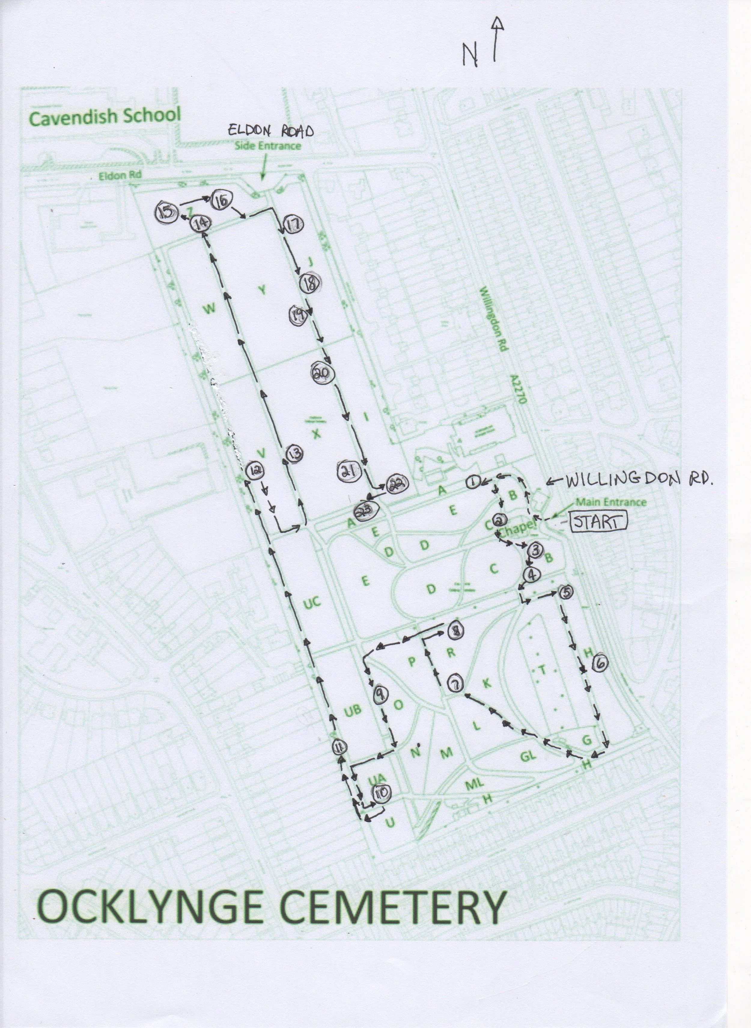 If you wish to follow the walk, start at the Willingdon Road gates outside the Chapel. The map on the left shows the number of the grave which is cross referenced in the description & pictures below.